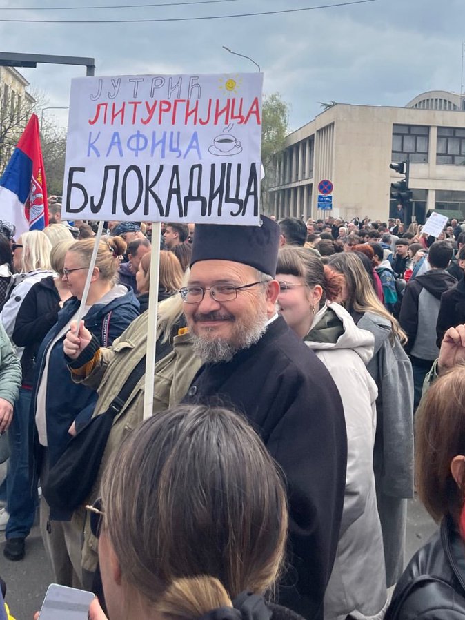 Naime, kako se vidi u objavama na društvenim mrežama, jedan sveštenik došao je na protest sa transparentom „Jutrić, liturgijica, kafica, blokadica“, prenosi nova.rs.