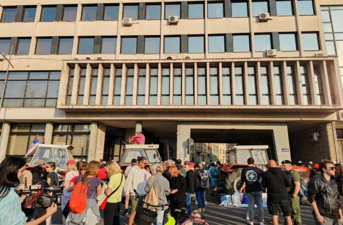 Nekoliko traktora blokiralo je ulaz u Skupštinu grada, a MUP je juče rano popodne ispred ovog zdanja u Ulici Žarka Zrenjanina postavio ograde, dok je u samoj zgradi interventna policija.