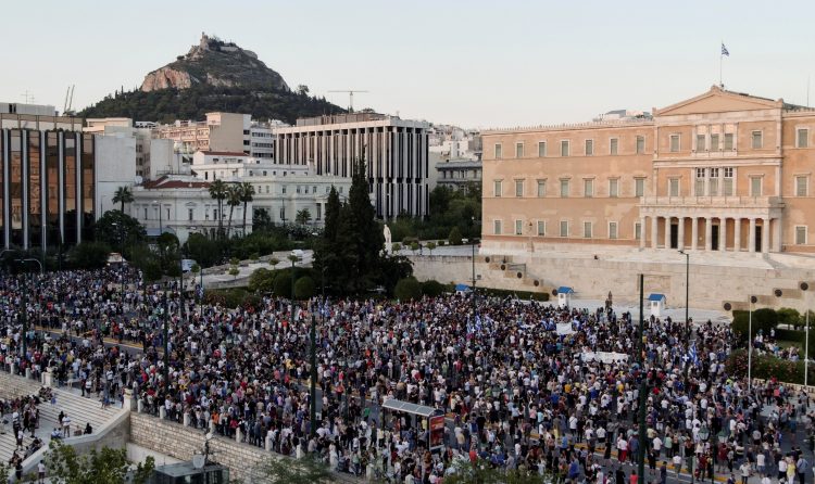 U Atini su demonstranti skandirali „Dalje ruke od naše dece!“ i držali transparent s natpisom „Mi kažemo ‘Ne!’ otrovu vakcine“.
