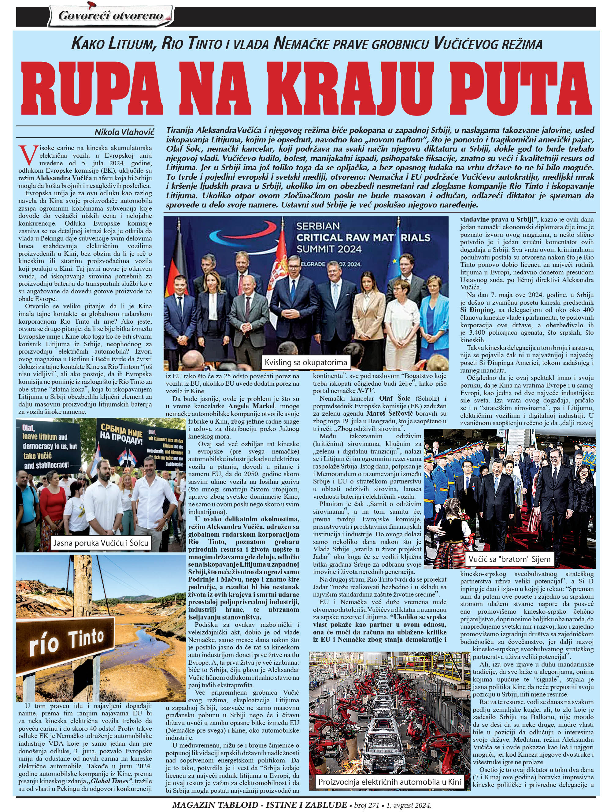 Otvorilo se veliko pitanje: da li je Kina imala tajne kontakte sa globalnom rudarskom korporacijom Rio Tinto ili nije? Ako jeste, otvara se drugo pitanje: da li se bije bitka između Evropske unije i Kine oko toga ko će biti stvarni korisnik Litijuma iz Srbije, neophodnog za proizvodnju električnih automobila? Izvori ovog magazina u Berlinu i Beču tvrde da čvrsti dokazi za tajne kontakte Kine sa Rio Tintom „još nisu vidljivi“, ali ako postoje, da ih Evropska komisija ne pominje iz razloga što je Rio Tinto za obe strane „zlatna koka“, koja bi iskopavanjem Litijuma u Srbiji obezbedila ključni element za dalju masovnu proizvodnju litijumskih baterija za vozila široke namene.