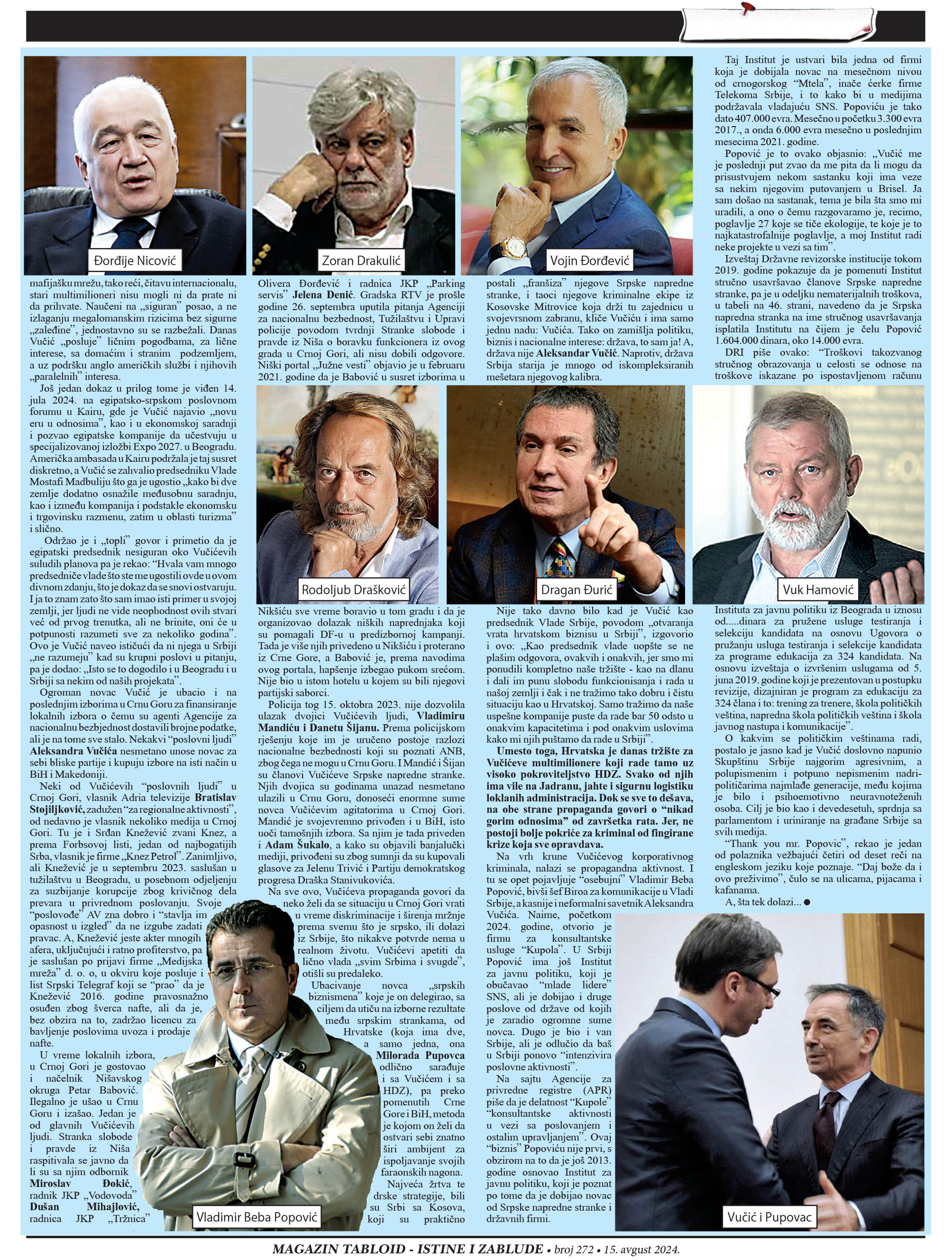 Na vrh krune Vučićevog korporativnog kriminala, nalazi se propagandna aktivnost. I tu se opet pojavljuje „osebujni“ Vladimir Beba Popović, bivši šef Biroa za komunikacije u Vladi Srbije, a kasnije i neformalni savetnik Aleksandra Vučića. Naime, početkom 2024. godine, otvorio je firmu za konsultantske usluge „Kupola“. U Srbiji Popović ima još Institut za javnu politiku, koji je obučavao „mlade lidere“ SNS, ali je dobijao i druge poslove od države od kojih je zaradio ogromne sume novca. Dugo je bio i van Srbije, ali je odlučio da baš u Srbiji ponovo „intenzivira poslovne aktivnosti“.