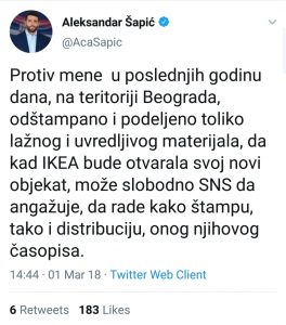 Ljudi koji su u političkim tokovima još godinama unazad su govorili da Aleksandar Šapić ima seksualne odnose sa Aleksandrom Vučićem, kao što je imao i sa Borisom Tadićem. Njega privlači vlast i moć, i ako u medijima pokušava da se predstavi kao neko ko je odmeren čovek, ali zapravo se radi o jednoj zveri koja uleće iz kreveta u krevet, željna vlasti i seksa sa muškarcima.