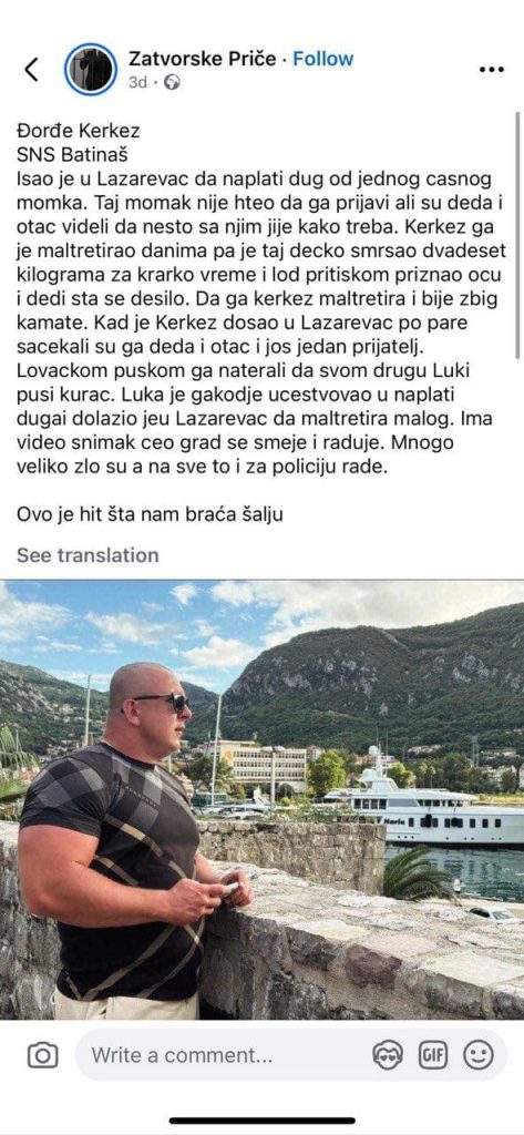 Naime, na društvenim mrežama, na jednoj zatvorenoj stranici, objavljena je poruka u kojoj se imenom i prezimenom pominje Đorđe Kerkez, SNS batinaš, uz tvrdnju da je povezan sa nasilnom naplatom dugova od neimenovanog časnog momka iz Lazarevca, ali tu su se umešali deda, otac i još jedan prijatelj, te su „razmontirali“ SNS batinaša.