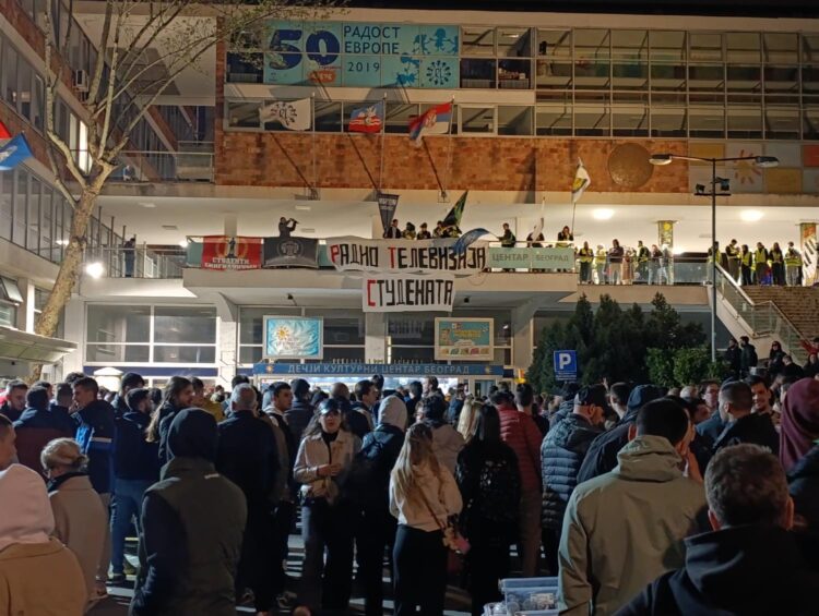 Podsetimo, studenti i građani sinoć oko 22h blokirali su ulaze u zgrade RTS u Takovskoj i na Košutnjaku, kao i u Novom Sadu, u zgradu Radio-televizije Vojvodina. Oko 5 sati jutros žandarmerija i interventna policija došle su do zgrade RTV-a na Mišeluku i potisnuli studente i građane sa glavnog ulaza zgrade javnog servisa Vojvodine sve do pešačke staze, koja se nalazi na dnu stepenica ispred zgrade.