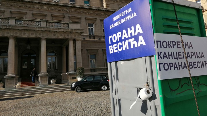 Mobilni toalet na kojem okačene table sa ispisom: „Pokretna kancelarija Gorana Vesića“ stigao je Ispred Skupštine